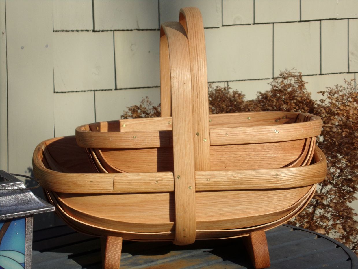Our most popular for the pragmatic gardener. can handle most any job & is closest to the "traditional" Sussex Trug. Red Oak handle, rim, & feet with copper nails. Strakes (inside ship~lapped pieces that form the basket) are either red oak or rock maple, which are secured to the feet with brass washer-head screws for added strength. Finished with natural linseed oil. **Reminder, this is for a "yet to be created" product.